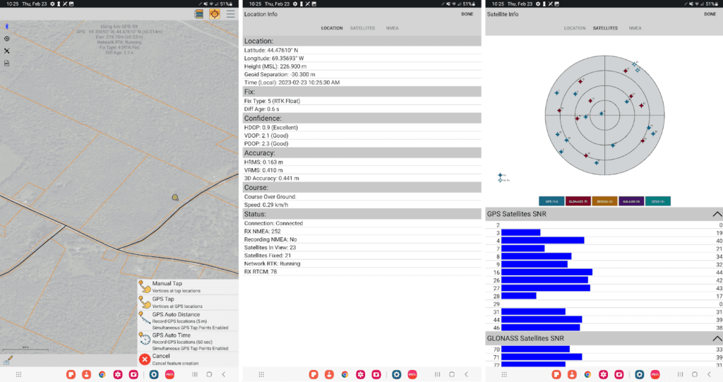 Med Reach RX ansluten via Bluetooth till Global Mapper Mobile Pro kan detaljerad platsinformation visas och data kan samlas in med hjälp av ett GPS-funktionsskapningsläge.