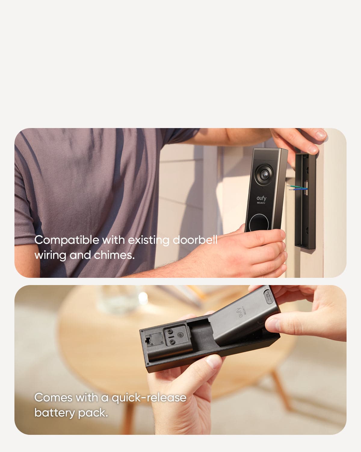 Eufy E340 är designad för att vara enkel att installera och använda. Den kan användas som en fristående enhet eller tillsammans med eufy HomeBase. Den är också kompatibel med eufy MiniBase Chime eller HomeBase (båda säljs separat). Du kan även använda dina befintliga klockor eller en Alexa Echo-enhet som klocka.